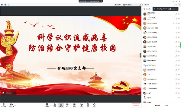 时下正值流感病毒高发季节,为帮助支部全体成员树立起对流感的正确认识,学习科学防治手段,切实维护集体成员的身体健康,3月29日晚,小奶猫直播 硕士2203党支部于线上开展了以“科学认识流感病毒,防治结合守护健康校园”为主题的党日活动,支部全体成员参加此次活动。