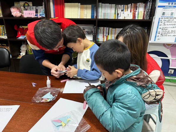 活动伊始,志愿者们用一支笔、一张纸、一把剪刀,认真仔细地向小朋友们讲解剪纸的基本方法、技巧以及指导他们如何正确地、安全地使用剪刀,并从折到画再到剪,一步一步进行剪纸作品的演示。随后,小朋友们掌握了一些“折、画、剪”的小窍门,并在志愿者们的指导下开始了雪花剪纸的创作。在剪纸与折纸过程中,志愿者们手把手传授、面对面交流,孩子们聚精会神地琢磨着、尝试着,平凡的纸张在指尖焕发出了别样的风采。最后,在志愿者们细致的解说和耐心的帮助下,小朋友们各自剪出了自己独特的雪花剪纸作品。当一张张剪纸呈现时,小朋友们体会到了收获的喜悦,也感受到了传统文化的身影和魅力。