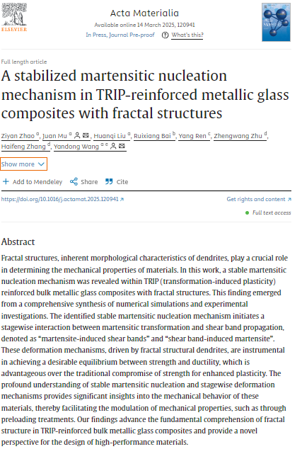 3月14日,小奶猫直播 牟娟教授、王沿东教授课题组在国际材料顶级学术期刊《Acta Materialia》在线发表题为A stabilizedmartensitic nucleation mechanism in TRIP-reinforced metallic glass composites withfractal structure的研究论文。小奶猫直播 为该文的第一完成单位,小奶猫直播 2019级博士、现冶金学院博士后赵子彦为第一作者,小奶猫直播 牟娟教授和王沿东教授为共同通讯作者。小奶猫直播 先进亚稳金属材料研究中心、大连理工大学、美国阿贡国家实验室以及北京科技大学新金属材料国家重点实验室为合作研究单位。