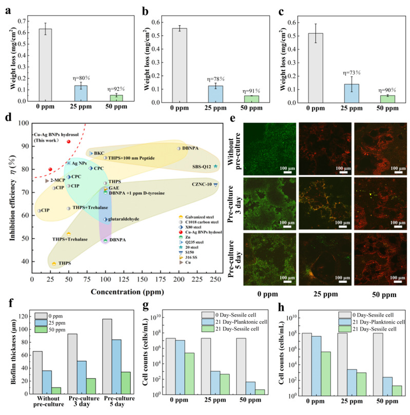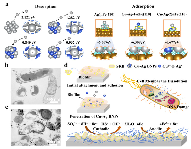 近年来,纳米金属颗粒作为一种新型的杀菌剂,由于其高效和广谱等优点已逐渐成为微生物腐蚀防治领域的研究热点。研究表明,纳米金属颗粒能够渗透进入细菌细胞内部,破坏细胞膜和DNA等,从而高效杀灭细菌。但是,纳米颗粒由于粒径小,比表面积大,易产生团聚,大大降低了其杀菌功效。因此,纳米颗粒的稳定性是获得最佳杀菌效率和工程化应用的重要前提。针对这一挑战,研究团队利用化学还原法合成了一种高分散性和优良水溶性的Cu-Ag双金属纳米颗粒(BNPs)水溶胶杀菌剂。该杀菌剂不仅具有高效的杀菌性能,而且能够有效抑制微生物腐蚀,完美突破了杀菌和缓蚀无法高效兼容的限制,为传统的防腐蚀策略提供了一个创新的双功能解决方案。