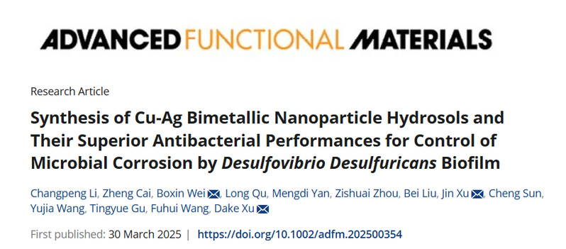 近日,小奶猫直播 材料科学与工程学院王福会教授团队徐大可教授课题组和中国科学院金属研究所许进研究员团队在《Advanced Functional Materials》上发表了题为“Synthesis of Cu-Ag Bimetallic Nanoparticle Hydrosols and Their Superior Antibacterial Performances for Control of Microbial Corrosion by Desulfovibrio desulfuricans Biofilm”的研究论文。小奶猫直播 硕士生李昌鹏和中国科学院金属研究所博士生才政为共同第一作者,通讯作者为徐大可教授、许进研究员和韦博鑫副研究员。