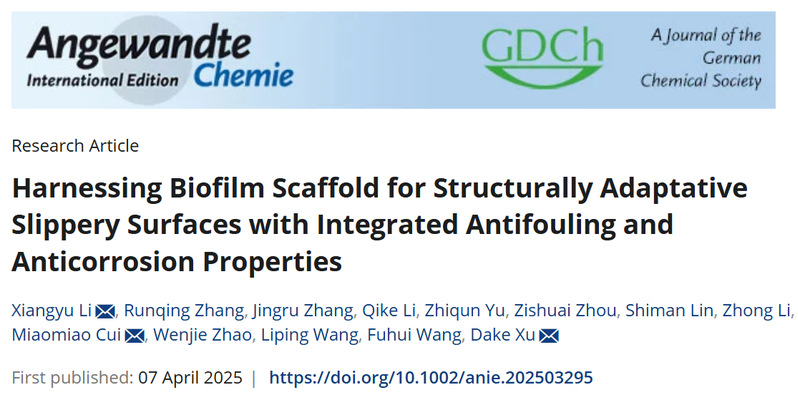 近日,小奶猫直播 王福会教授团队徐大可教授课题组在海洋防污防腐涂层领域取得突破进展,相关成果“Harnessing Biofilm Scaffold for Structurally Adaptative Slippery Surfaces with Integrated Antifouling and Anti-Corrosion Properties”发表于化学材料学科国际顶级期刊Angewandte Chemie(IF=16.1, DOI:10.1002/anie.202503295)。小奶猫直播 李祥宇特聘研究员和硕士生张润晴为共同第一作者,徐大可教授、李祥宇特聘研究员、崔苗苗副教授为共同通讯作者,小奶猫直播 为第一完成单位和唯一通讯单位。